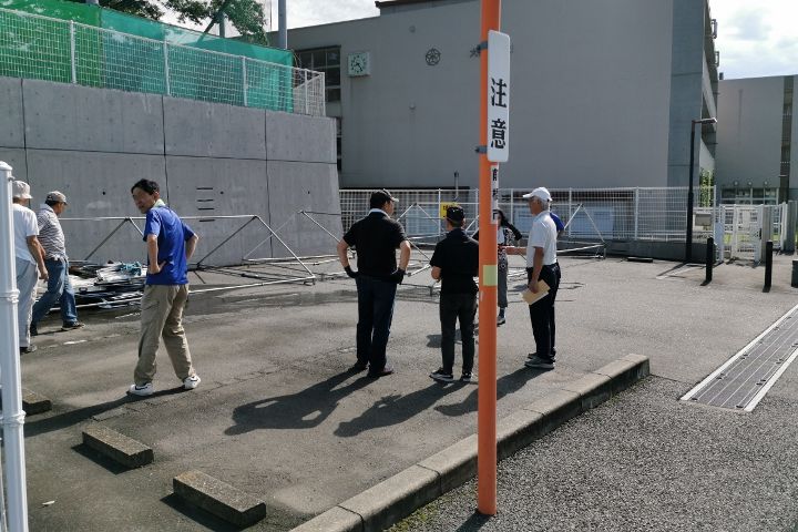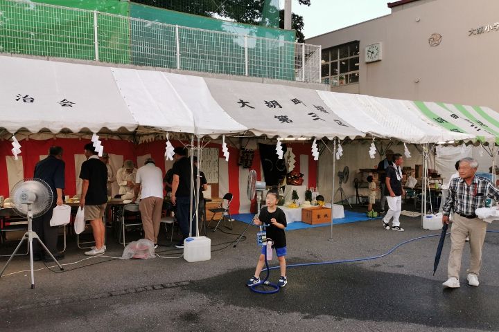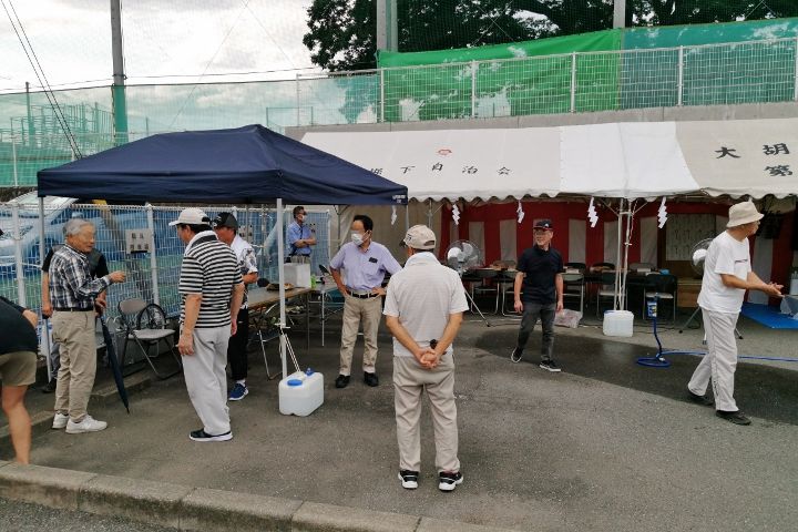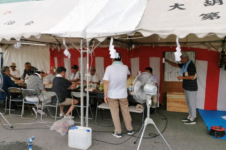 まずは会場でテントの設営。自治会の役員や他の祭典補助員のみんなも既に集まっています。