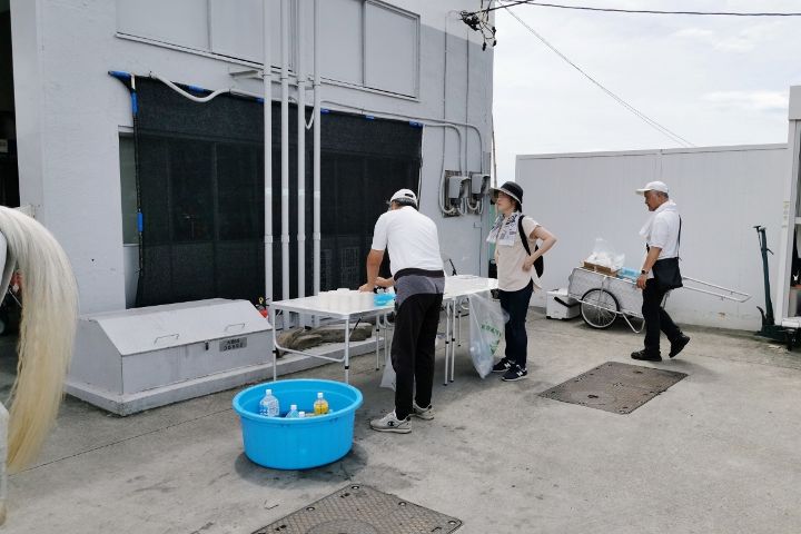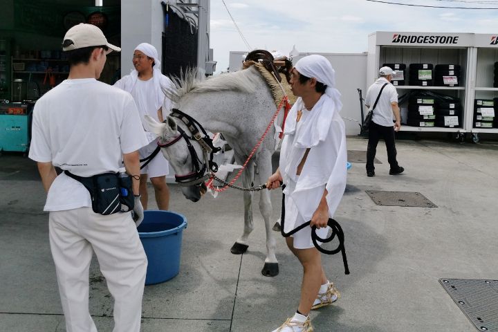 到着するなりバケツの水をガブ飲みしていたので、やはり馬でもこの暑さは堪えるか。