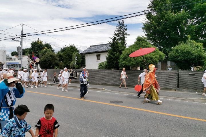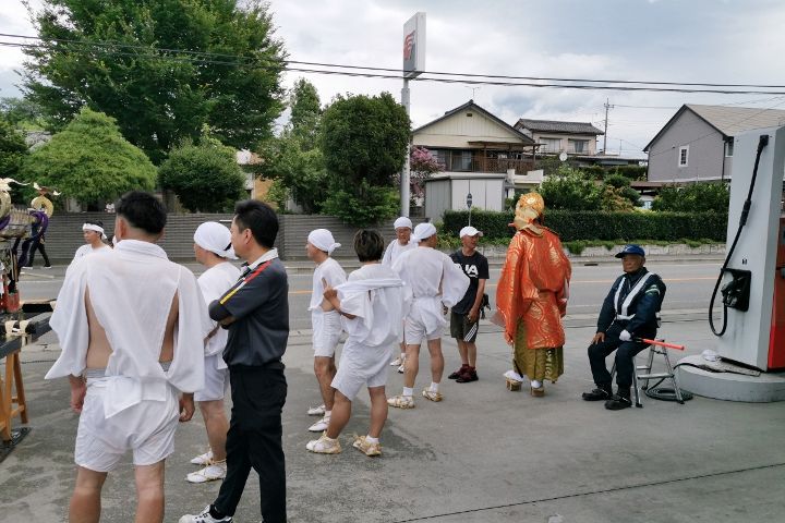 ふと気が付くと、もう一人の主役である天狗の面をした人も。この暑さの中、スゲー厚着で大変そう。