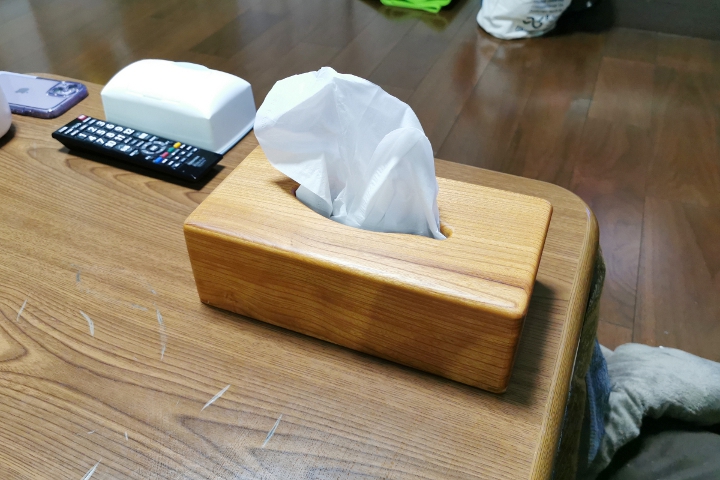 で、こちらが木まま工房さんで買った手作りのティッシュボックス。シンプルながら丁寧な造りで、ウチのコタツテーブルとの調和も素晴らしい。